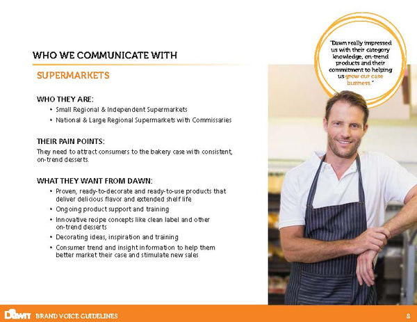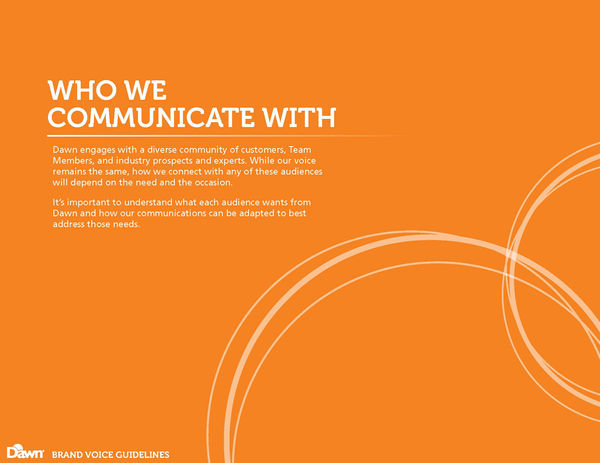 As Dawn reimagined its brand identity, I was tasked with creating a document that captured and defined their brand voice. Using key brand elements, I designed a layout that visually reflected their updated look and feel. The guide broke down various audience segments and outlined the appropriate tone and messaging for each. The result was a comprehensive brand voice guide that has since become a foundational tool for their communications moving forward.